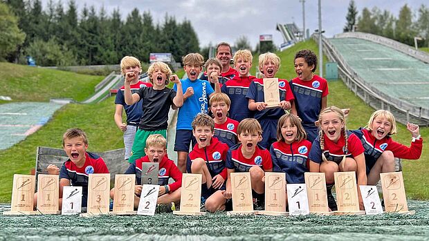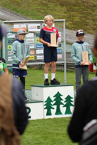 „Ein bisschen haben wir ein schlechtes Gewissen, weil die Höhnharter so gastfreundlich zu uns sind. Da reißt man eigentlich nicht gleich die ersten fünf Plätze an sich“, meint Paul Kaman, unser zehnjähriger Stadtadler aus der niederösterreichischen Region Schwechat, der beide Fünffachsiege anführt. „Noch dazu gibts hier so außergewöhnliche Pokale. Das sind schon zwei ganz besondere Siege.“ Mit zwei Sprüngen auf 27,0 Meter ist Platz 1 für ihn am ersten Tag völlig ungefährdet, am zweiten liegt Paul mit 25,5 und 25,0 Metern immer noch jeweils einen Meter vor seinem ersten Verfolger aus dem eigenen Team. Emanuel Urbanek (10) aus dem niederösterreichischen Baden wird am ersten Tag mit 25,5 und 26,0 Meter Zweiter und mit 23,5 und 24,0 Metern am zweiten Tag Fünfter. Albin Hauser (9) aus Wien-Hernals schafft es als Jüngster unter den Top 10 an beiden Tagen aufs Stockerl - mit 24,5 und 23,0 Metern am ersten Tag auf Platz 3 und 24,5 und 24,0 Meter am zweiten Tag sogar auf Platz 2. Das Siegerpodest komplettiert am zweiten Tag Raffael Swatek (10) aus Wien-Penzing mit 25,0 und 24,0 Metern auf Platz 3. Einen Tag davor wird er mit 22,5 und 23,5 Metern Fünfter. Und dann gehört auch noch Tim Miksch, unser zehnjähriger Stadtadler aus der niederösterreichischen Region Mödling, zum Fünffachsieg-Dreamteam: An beiden Tagen sichert er sich Platz 4, zuerst mit 23,0 und 23,5 Metern und tags darauf mit 24,5 und 23,5 Metern.