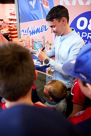 Gesamtweltcupsieger Stefan Kraft auf Wien-Besuch: Frisch ausgezeichnet mit der Großen Kristallkugel als bester Skispringer dieser Wintersaison hat "Krafti" unsere Stadtadler-Kids zum Fachsimpeln eingeladen. Im Manner-Store am Hauptbahnhof hat unser österreichischer Überflieger nicht nur Autogrammkarten für alle Mädchen und Burschen mitgehabt, sondern auch die wertvolle gläserne Trophäe, die er ein paar Tage zuvor zum Saisonende verliehen bekommen hat.