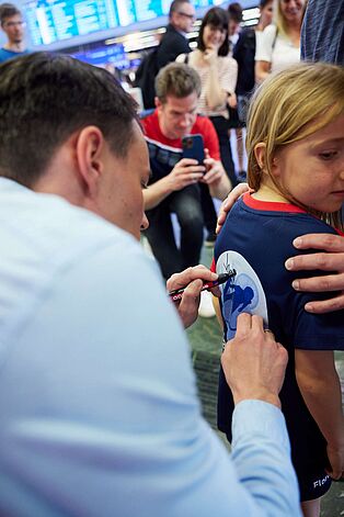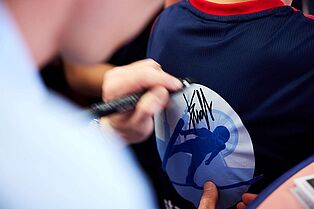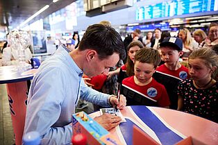 "Ich freu' mich immer Euch zu sehen, ein paar Gesichter von Euch Stadtadlern kenn' ich ja schon", begrüßt Stefan Kraft die gut 20 Kids aus unserem Verein, die extra schnell nach Schulschluss zum Treffen mit dem Gesamtweltcupsieger gedüst sind. Gemeinsam mit unserem Partner Manner hat sich Krafti Zeit für jede einzelne Frage, jedes Selfie und jeden einzelnen Autogrammwunsch genommen - ganz egal ob Unterschrift am Stadtadler-Shirt, am Skisprunghelm oder auf den mitgebrachten Ski. Von seinem Wien-Besuch haben natürlich auch andere Fans mitbekommen und so haben ihm auch ÖBB-Chef Andreas Matthä und die neue Manner-CEO Sabine Brandl Geschenke mitgebracht - und auch unseren Stadtadler-Kids die ein oder andere Süßigkeit überreicht.